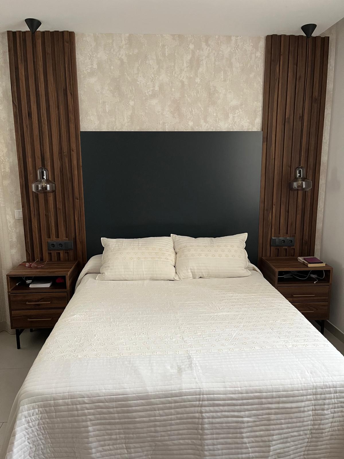 El dormitorio principal cuenta con un cabecero mural diseñado a medida, compuesto por listones verticales de madera y un panel central en negro mate. Las mesillas, realizadas en el mismo acabado, se integran perfectamente en el conjunto, aportando simetría y equilibrio. El armario empotrado, fabricado a medida, combina frentes lisos en madera oscura con tiradores en el mismo tono, creando una estética limpia y elegante.