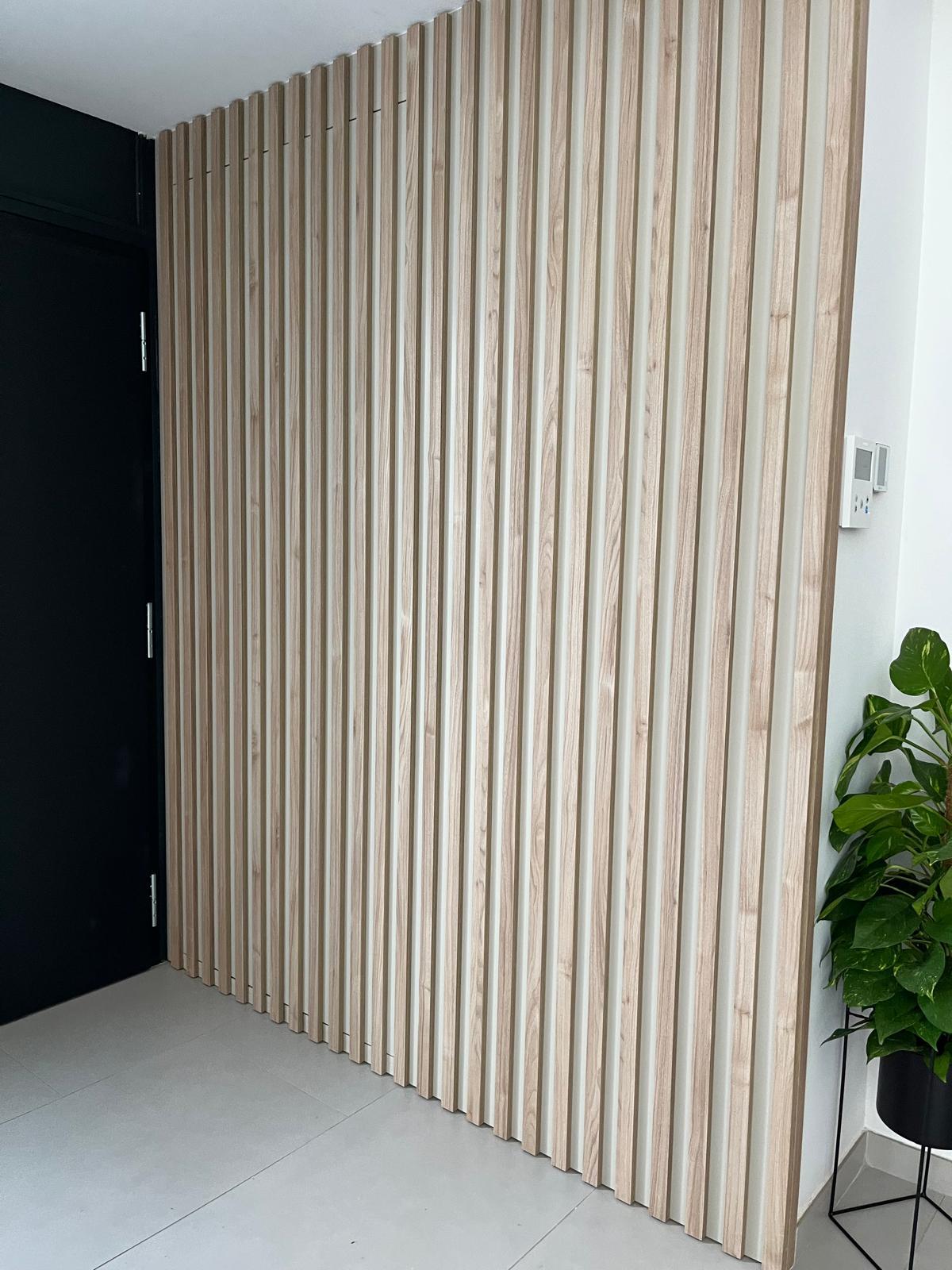 En la entrada se ha instalado un panelado decorativo de lamas verticales en madera clara que aporta textura, continuidad y un efecto de amplitud al espacio.