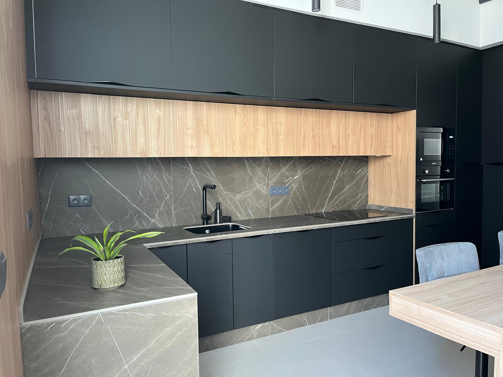 La cocina se compone de mobiliario en laminado negro supermate con tirador integrado a la cabeza, combinado con módulos superiores y panelados en madera natural. La encimera y el frente están realizados en porcelánico con veta continua, aportando un acabado elegante, resistente y de fácil mantenimiento. El diseño se completa con una mesa integrada en el mismo acabado de los frentes superiores, creando un espacio práctico y visualmente unificado.
