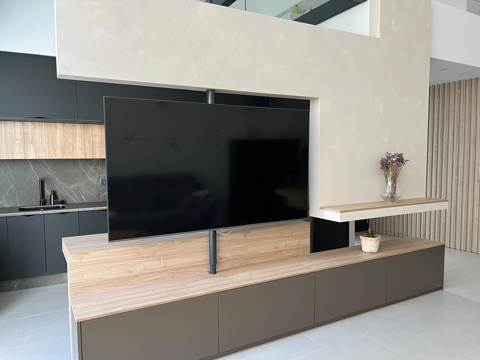 En el salón destaca un mueble modular a medida que integra el televisor sobre una estructura metálica central. La composición combina frentes lacados en tono tierra con encimera y detalles en madera natural, manteniendo la continuidad visual con la cocina y aportando calidez al ambiente.